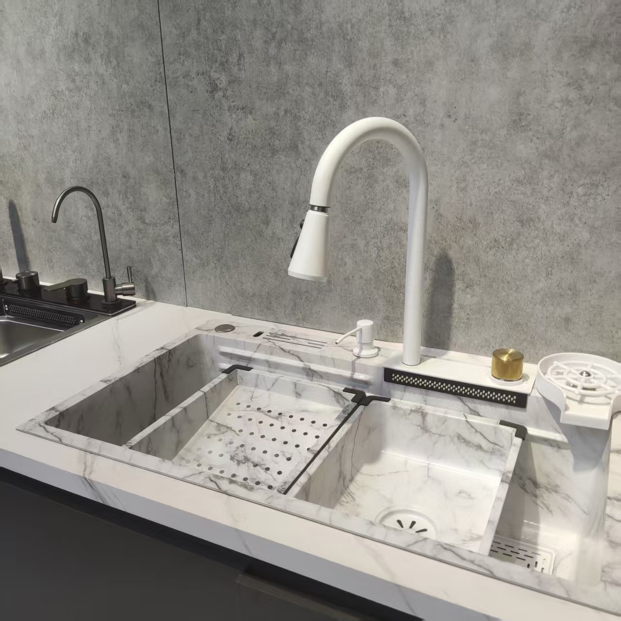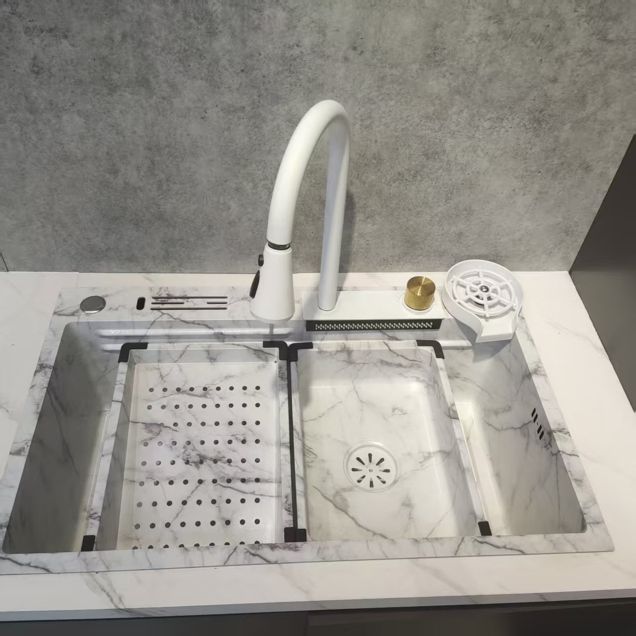 | อ่างล้างจานในครัวแบบสองหลุมพร้อมก๊อกน้ำโค้งสูง | 900×550×230 มม. | ช่องระบายน้ำมุมกว้าง |