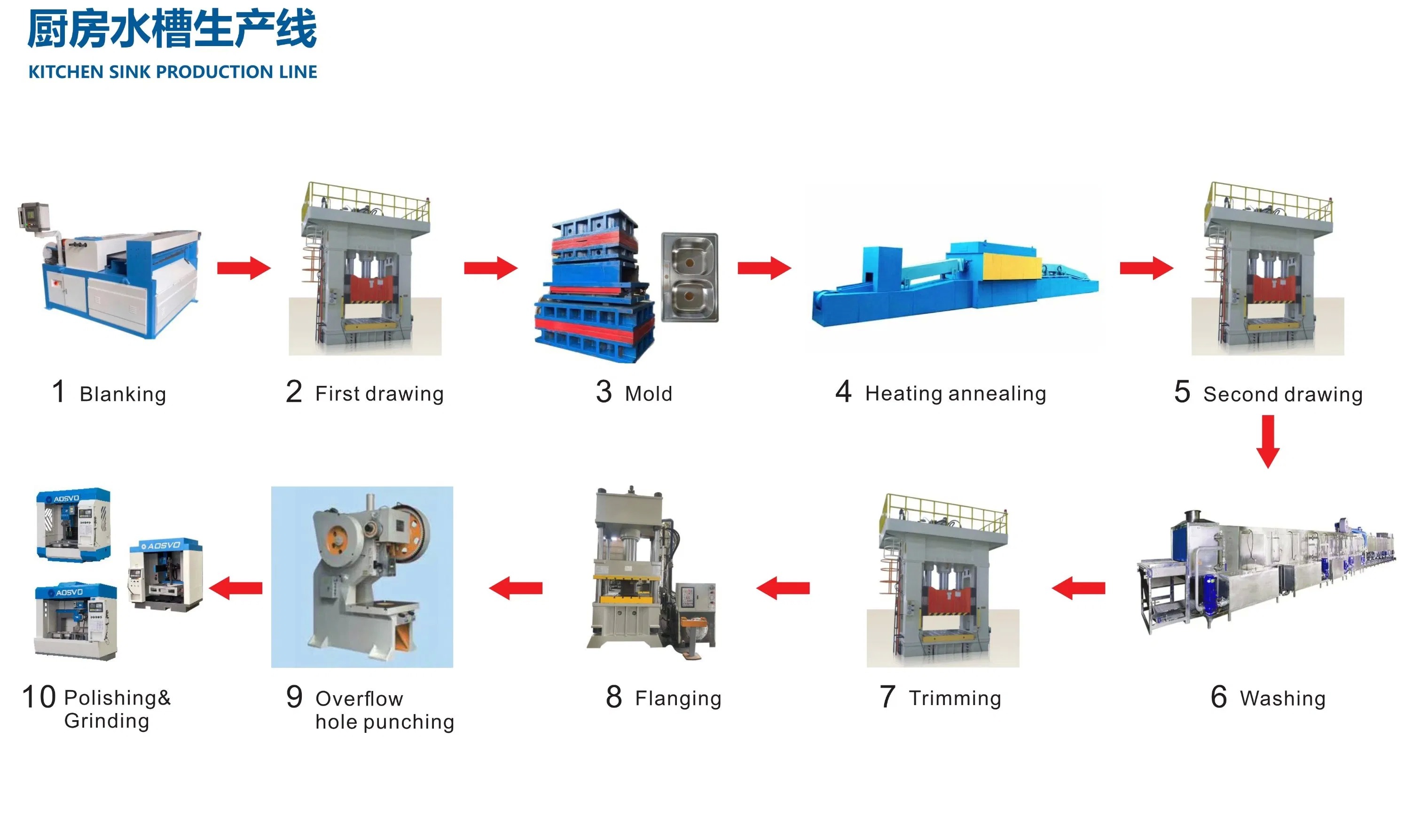 Complete kitchen sink production line handmade sink manufacturing machine, the production line is a saving stainless steel material handmade sink manufacturing method. By splicing stainless steel sheets, the material utilization rate is improved, and the material cost of each sink is saved by about $1. At the same time, the investment in machinery and equipment is less, there is no need to customize the stamping die for the sink of different specifications and sizes, the production is flexible, the new product is put into production quickly and the investment is less. Manufactured kitchen sink high-grade and beautiful, and hot selling.